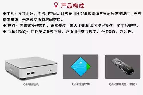 Quick Present是為現(xiàn)代會(huì)議和教學(xué)研發(fā),基于無(wú)線網(wǎng)絡(luò)的便捷式傳屏協(xié)作設(shè)備??珊?jiǎn)單快速的將內(nèi)容傳輸?shù)窖菔酒聊伙@示,同步音頻和操作。僅需為顯示屏接入一臺(tái)小巧的Q&P主機(jī),便可在客戶端通過執(zhí)行軟件, 實(shí)現(xiàn)一鍵傳屏的功能。軟件支持PC、MAC、iPhone、Pad或Windows平臺(tái)運(yùn)行,客戶端數(shù)量無(wú)限制。