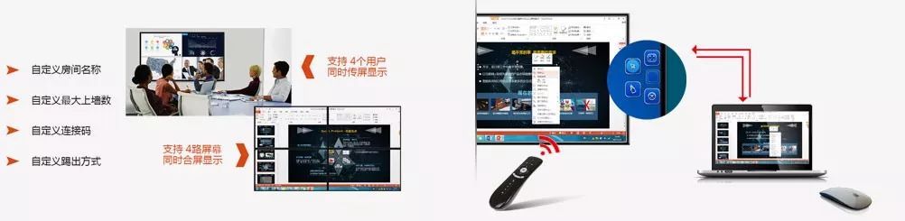 任何移動(dòng)終端設(shè)備連接Q&P所在局域網(wǎng),均可將內(nèi)容投到顯示屏上。通過管理員執(zhí)行會(huì)議控制,則可控制與會(huì)人員。