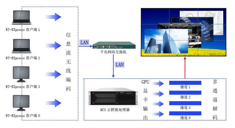 MCS云拼接處理系統(tǒng)各設(shè)備之間通過千兆網(wǎng)絡(luò)進(jìn)行連接,突破了傳統(tǒng)拼接對(duì)于信號(hào)輸入顯示的方式(傳統(tǒng)方式是通過VGA線纜、DVI線纜接入到純硬件拼接處理器等設(shè)備切換到大屏幕上的顯示方式,需要開啟多臺(tái)PC切換至所需要的應(yīng)用內(nèi)容才能鏡像到大屏上顯示這就需要使用大量設(shè)備輸出圖像,導(dǎo)致系統(tǒng)復(fù)雜,成本高)。MCS云拼接控制器是把網(wǎng)絡(luò)流媒體視頻信號(hào)用硬件編解碼設(shè)備編碼,將流媒體信號(hào)還原解碼處理,再還原成復(fù)合視頻信號(hào)方可輸入處理顯示。
