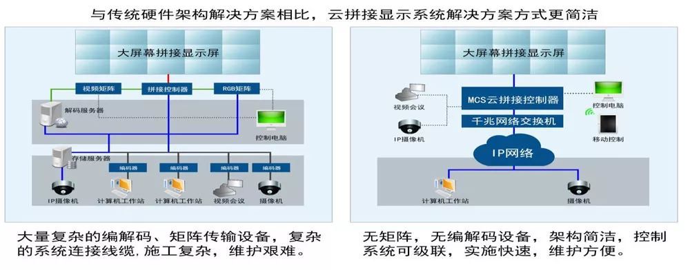我們?yōu)槭裁匆捎眠@樣的方式來(lái)顯示呢?客戶不再需要插拔各種雜亂的線纜,不再需要使用各種圖像輸出設(shè)備,極大提高設(shè)備的穩(wěn)定性,并降低成本;智能的MCS云拼接處理器會(huì)自動(dòng)管理圖像輸出,確保在大屏上準(zhǔn)確顯示。