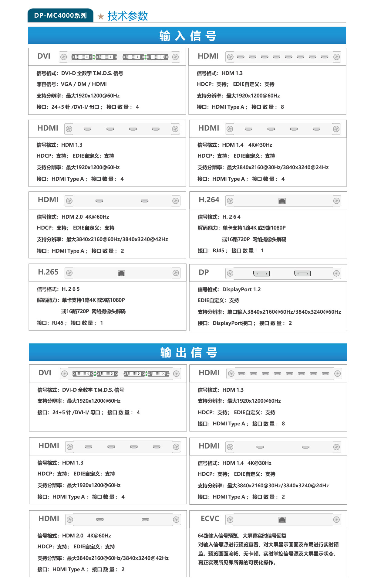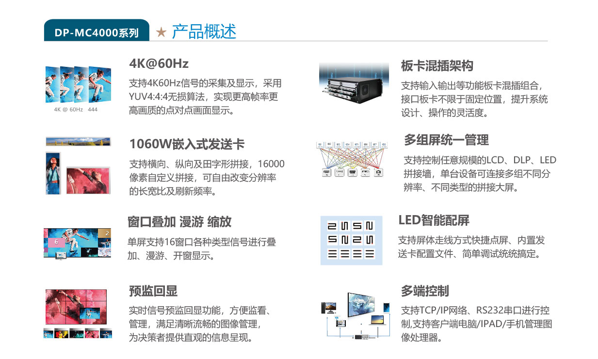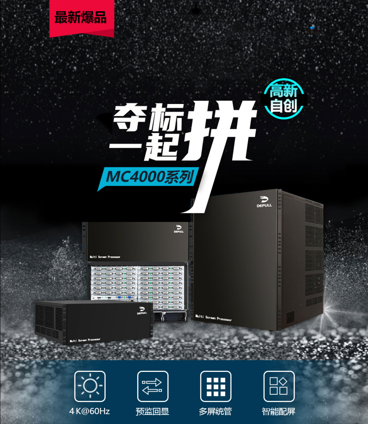 DP-MC4000系列拼接處理器,是DEPULL專為中大型屏幕拼接項目最新推出的,采用純硬件架構(gòu)、無操作系統(tǒng)的高性能視頻拼接處理器,具備強大的“真4K”信號處理能力,強大的擴容能力,支持板卡混插,支持RGB8:8:8色彩完美還原。